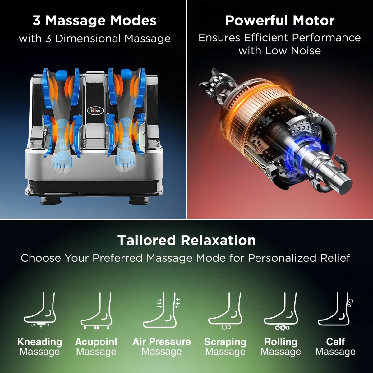 - Massage functions: Different Types of massages like kneading Massage, Acupoint massage, Air Pressure Massage, Scraping Massage, Rolling Massage & Calf Massage to maximize Relief to the Muscles.