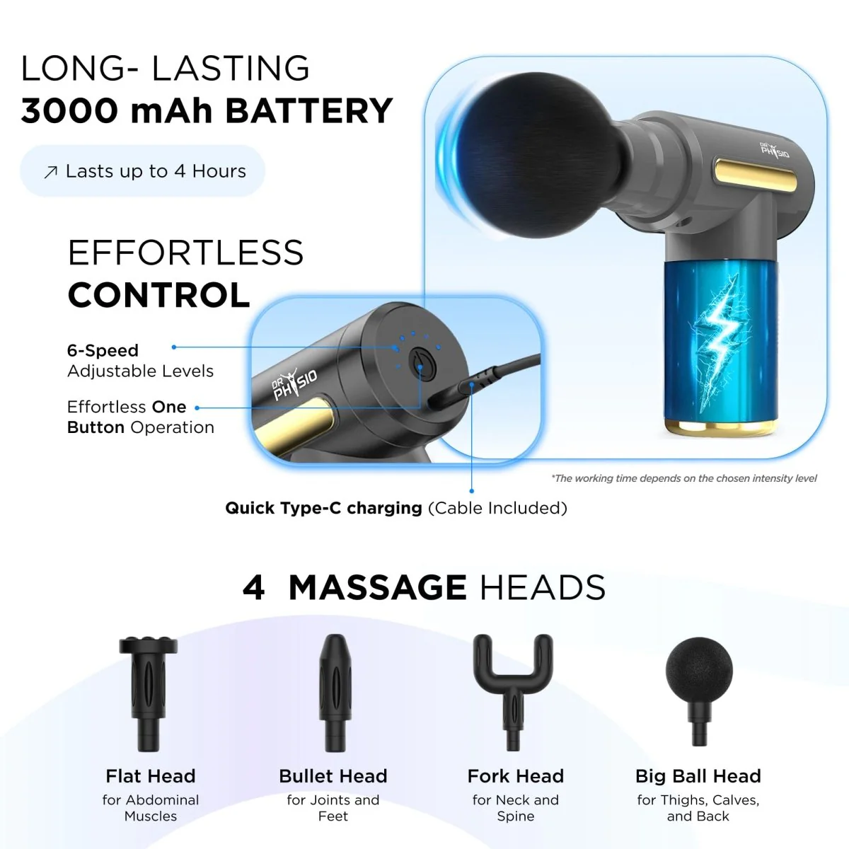 Experience ultimate relief and relaxation with the Dr Physio Rechargeable Massage Gun, your perfect companion for unwinding anywhere, anytime. Its cordless, ergonomic design fits seamlessly into your lifestyle—whether you're at home, at work, or hitting the gym—and its compact size makes it super easy to carry. Tailor your massage just the way you like it with 6 adjustable intensity modes and 4 specialized heads designed to target sore muscles, back pain, or joint stiffness with precision. Powered by a strong 24W motor, it delivers up to 3200 strokes per minute for deep tissue relief, all while operating quietly, and so nothing disturbs your moment of relaxation. With a long-lasting battery offering 90 to 150 minutes of use and quick 3-4 hour recharging, it’s always ready when you need it. Plus, the auto-off function ensures safe, hassle-free sessions. Whether you’re looking for a quick recovery after a workout or a thoughtful gift for someone special, this massager is designed to make every moment feel better. Gun massager for muscle recovery and relaxation, deep tissue percussion massage machine, handheld massagers, rechargeable deep tissue massage gun, and professional handheld deep tissue percussion massager