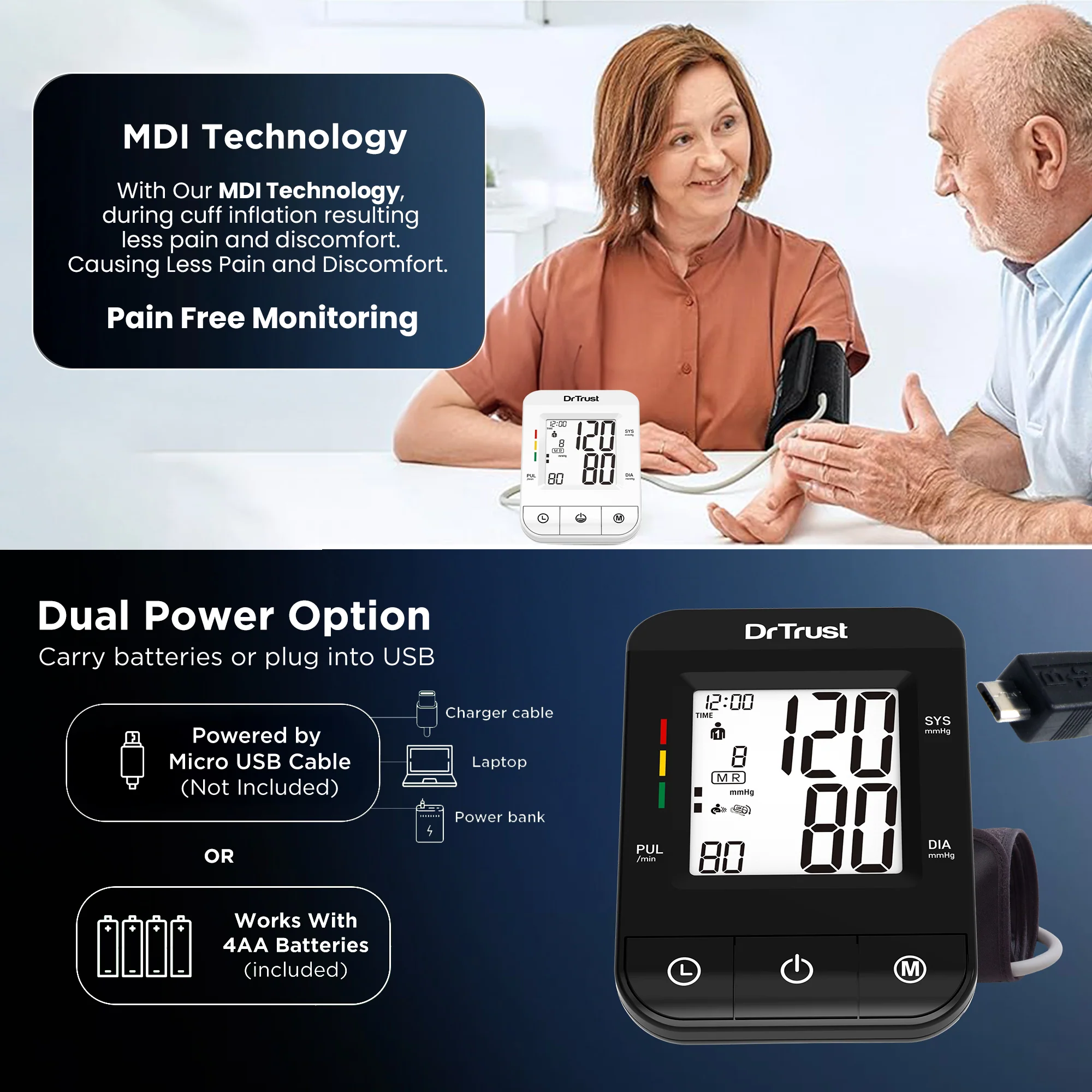 - Mdi technology Dr Trust comfort pro measures the blood pressure accurately during inflation, you don’t need to wait for deflation resulting in a more accurate blood pressure measurement