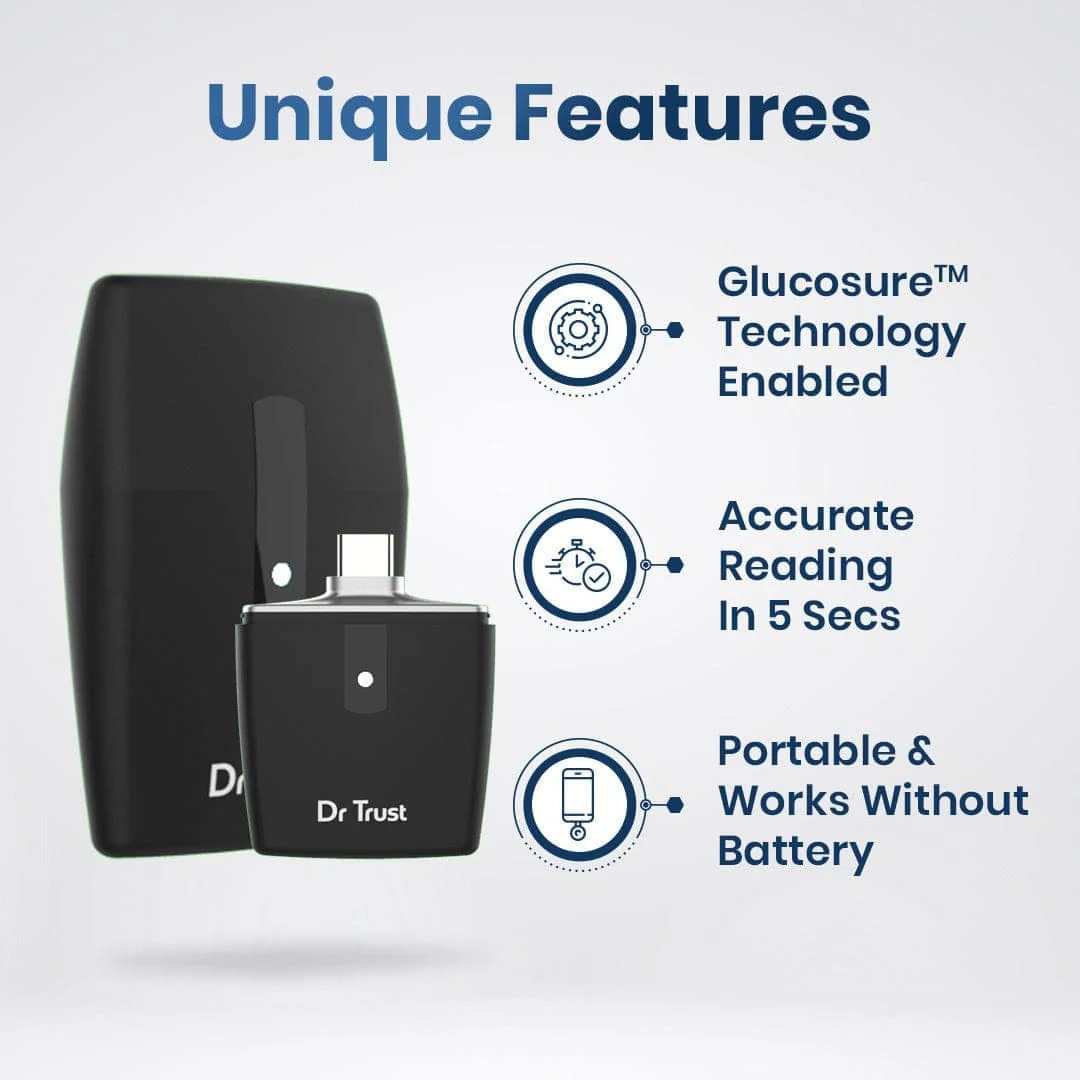 Now you can use your phone as Glucometer! With a Type C port connectivity to smartphones, it works seamlessly with all Android phones and gives you free access to Dr Trust 360 App. By connecting to this feature-rich app, you can manage, record, analyze all your sugar levels hassle-free.
