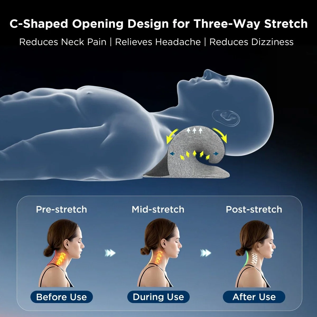 Restore a natural posture effortlessly and enjoy the benefits of enhanced well-being! The innovative C-shaped opening of this neck traction device allows you to customize your stretch, targeting different muscle levels for increased neck and upper back flexibility.