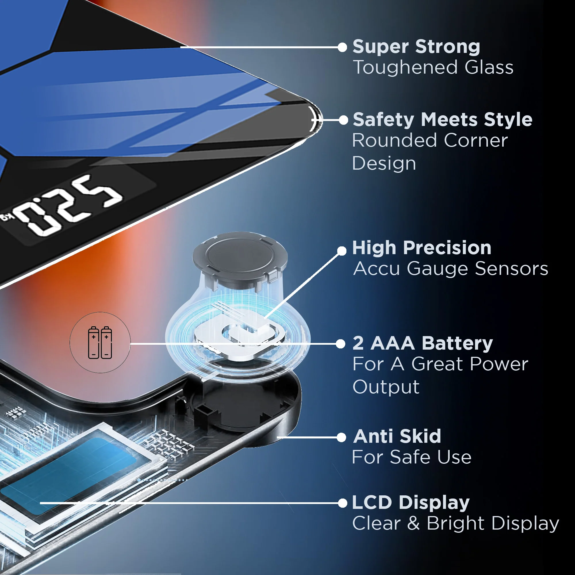 Crafted with a durable 6mm tempered glass body, our digital body weight machine offers a safe and sturdy platform for weight measurement. The sleek black body with blue color design adds a touch of elegance to any home or bathroom décor, while the rounded corners and anti-skid feet prevent accidents and ensure stability during use.