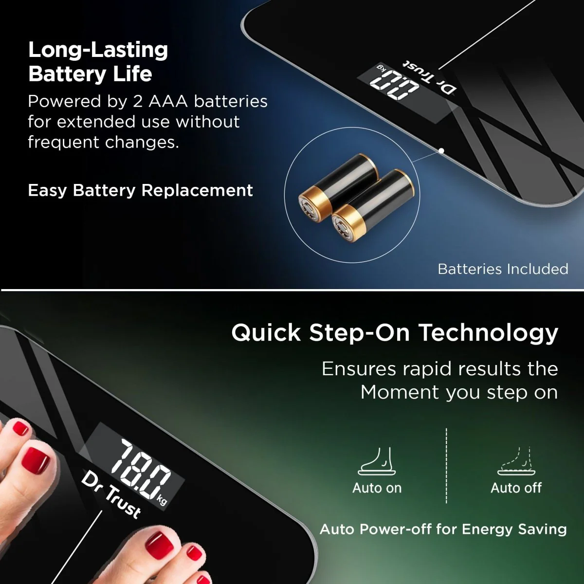 Powered by 2x1.5V AAA batteries, the Dr Trust Inspire Personal Scale - 523 comes with an auto power-off feature for long-lasting battery life. For auto-calibration, it would require to step on the scale and step off immediately so that the scale gets calibrated.
